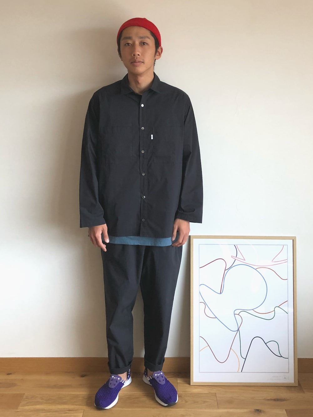 セットアップは足元か頭にワンポイントを 持ってくるのが定番かと。 両方に入れるのは欲張り。 足し算ではなく引き算をした方が シンプルで格好良い。 どちらのアイテムも気に入り過ぎて 両方入れちゃった。笑