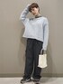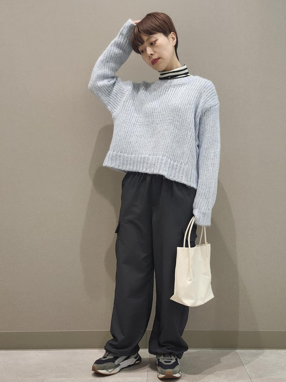 ラメリリーニットは ざっくりした編み地で 軽やかな印象です。 カーゴパンツと合わせて ちょっとそこまで行ける お出かけスタイリングです。 とても寒がりなので リブタートルをレイヤードしました。 靴、アクセサリーはスタッフ私物です。