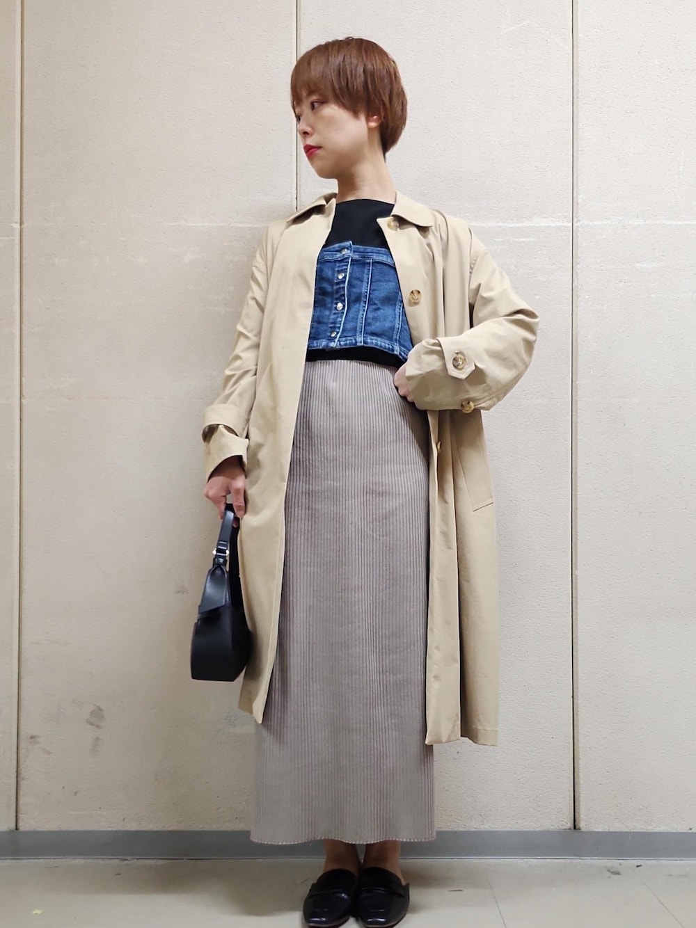 ジョーゼットトップスは 袖のボリュームがおしゃれ。 デニムビスチェを重ねて メリハリのあるシルエットにしました。 春のお出かけに嬉しい 花粉ガード&撥水加工付きの スプリングコートを羽織って 屋外でも安心のコーディネートです。 アクセサリーはスタッフ私物です。