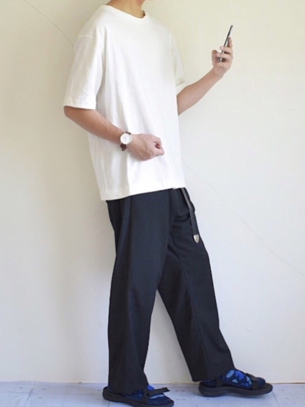 Instagram→《@weartiger0118》 Twitter→《@weartiger0118》 今日のコーデの配色は ホワイト×ブラック×ブルー いつも見て頂き、いいね、お気に入りなど ありがとうございます! 今日はシンプルに白Tシャツ、ワイドパンツ、 サンダルで合わせたゆる夏コーデです! SHOTAくん、jiinoくん主催の ファッションコンテストに 参加させていただきます!🙄💭 シンプルだけど靴下などで 少し個性を出しました!✨ 今日のコーデいいと思ってくれたら いいね、お気に入り、コメント、フォロー よろしくお願い致します!! また、フォルダ等に入れて頂けると とても嬉しいです!! コメント欄が寂しいので コメント頂けると喜んで返します!🙄💭 Instagramも頑張ってますので フォローの程よろしくお願いします!✨ また更新します!それでは👋 《サイズ表》 Tシャツ M パンツ S