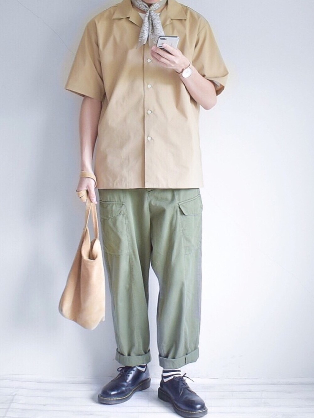 いつも見て頂きありがとうございます! 今日のコーデの配色は ベージュ×カーキ×ホワイト×ブラック 《coordinate》 オープンカラーシャツ、白Tシャツ、 古着のカーゴパンツ、ボーダーソックス、 革靴、バッグ、バンダナで合わせた アースカラー夏コーデです。 《point》 ベージュのオープンカラーシャツと カーキのカーゴパンツでラフにコーデ バンダナや、ボーダーの靴下でアクセントを 入れて遊び心がある夏コーデに! 革靴でまとまりを持たせました! 今日の朝出勤前に急いで撮った写真で これ以外何故か白飛びしてていい写真が なかったので、多分明日とかに撮り直し すると思います😭写真が気に入ってない笑 《ブランド詳細》 shirt→ urbanresearch Lサイズ Tshirt→ UNIQLOU XLサイズ pants→ @USED Mサイズ bag→ Sankyo shokai socks→ 無印良品 watch→ nordgreenofficial_japan bandana→ urbanresearch shoes→ Dr.Martens 今日のコーデをいいと思ってくれたら いいね、お気に入り、コメント、フォロー よろしくお願い致します!! また、フォルダ等に入れて頂けると とても嬉しいです!!😂 そして、コメント欄が寂しいので コメントを頂けると喜んで返します!🙄 Instagramに力を入れています! WEARには載せていない画像なども 載せていますので、是非見て欲しいです。 よろしければフォローをお願い致します! Instagram→《@weartiger0118》 Twitter→《@weartiger0118》
