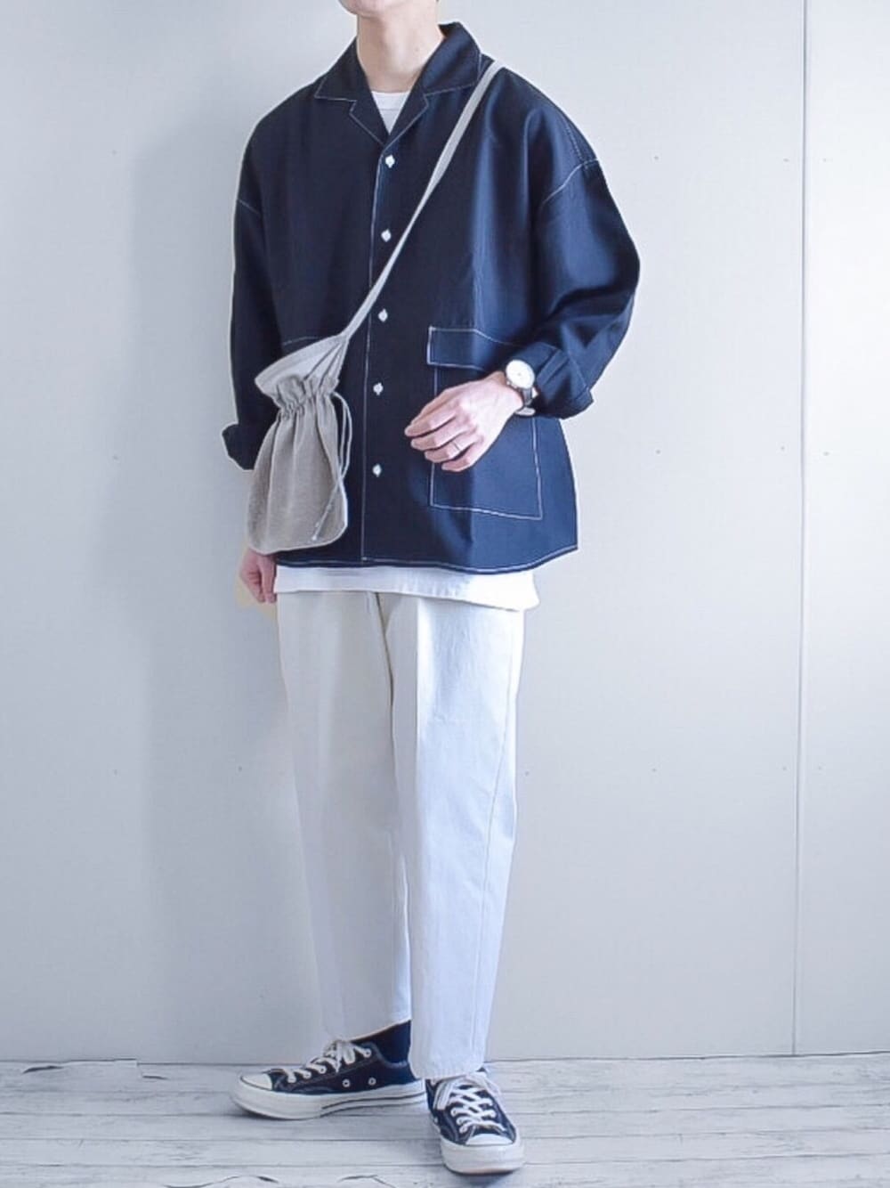 いつも見て頂きありがとうございます! 今日のコーデの配色は ブラック×ホワイト×グレー ZIP FIVEのステッチシャツと白パンツを 合わせたモノトーンコーデです! 大人な印象のコーデをイメージして コーデを組みました!白Tのレイヤードが 結構重要です!💭こういうコーデには Hender Schemeの巾着バッグが合いますね!