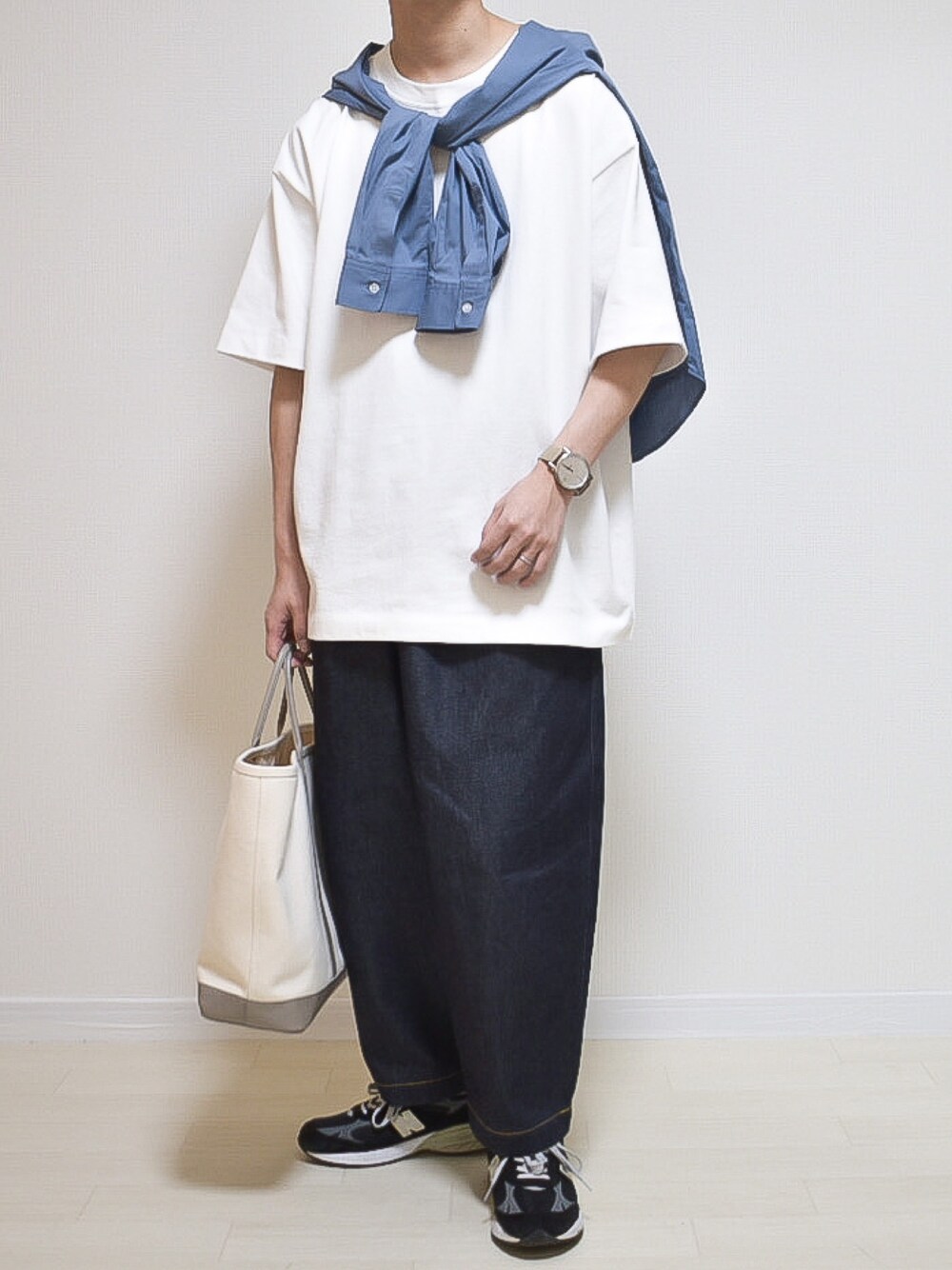 ブルー×ホワイト×デニム×ブラック 白T×デニムの王道コーデに 水色シャツを肩掛けしてこなれ感あるコーデに!
