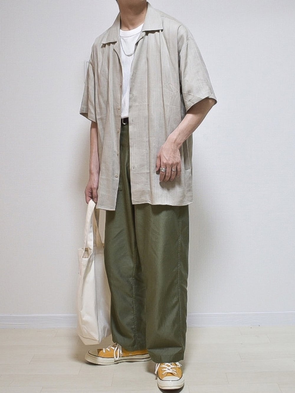 いつも見て頂きありがとうございます! ベージュ×ホワイト×カーキ×イエロー カーキのベイカーパンツにベージュの シャツを合わせたゆるコーデです! イエローの差し色がたまらん!