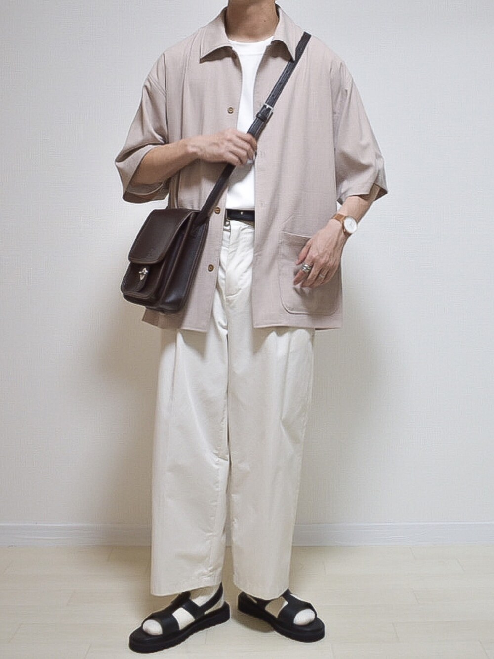 いつも見て頂きありがとうございます! ベージュ×ホワイト×ブラック 夏らしいリネンシャツに白パンツを 合わせたコーデ。サンダルを合わせて 更に季節感あるコーデに。ブラウンの ショルダーバッグでコーデをまとめました!