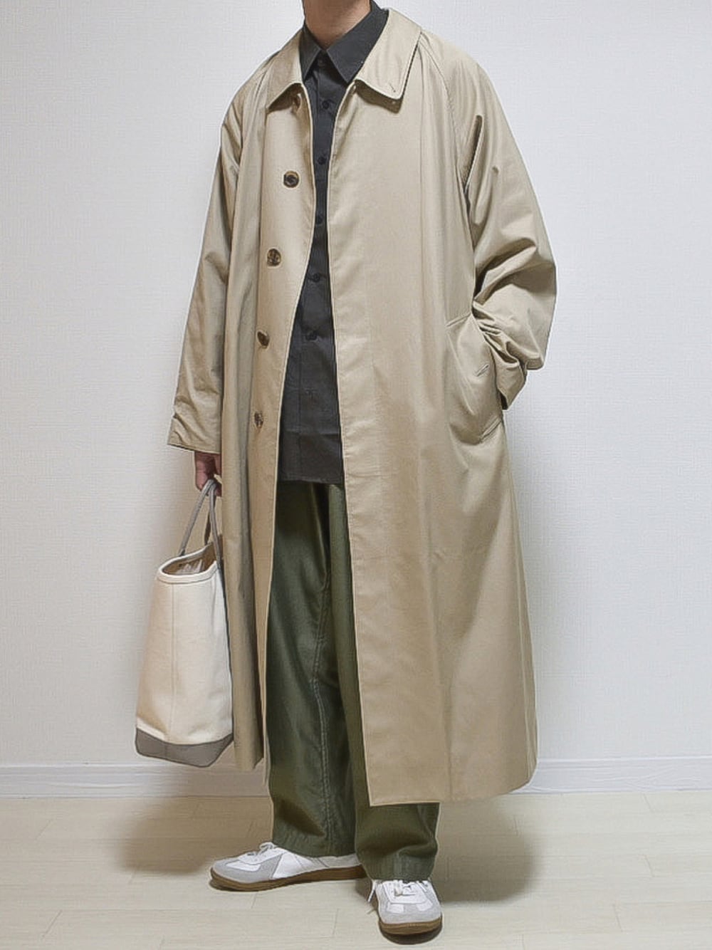 いつも見て頂きありがとうございます! ベージュ×グレー×カーキ×ホワイト ベージュのステンカラーコートに ベイカーパンツを合わせてアースカラーコーデ!