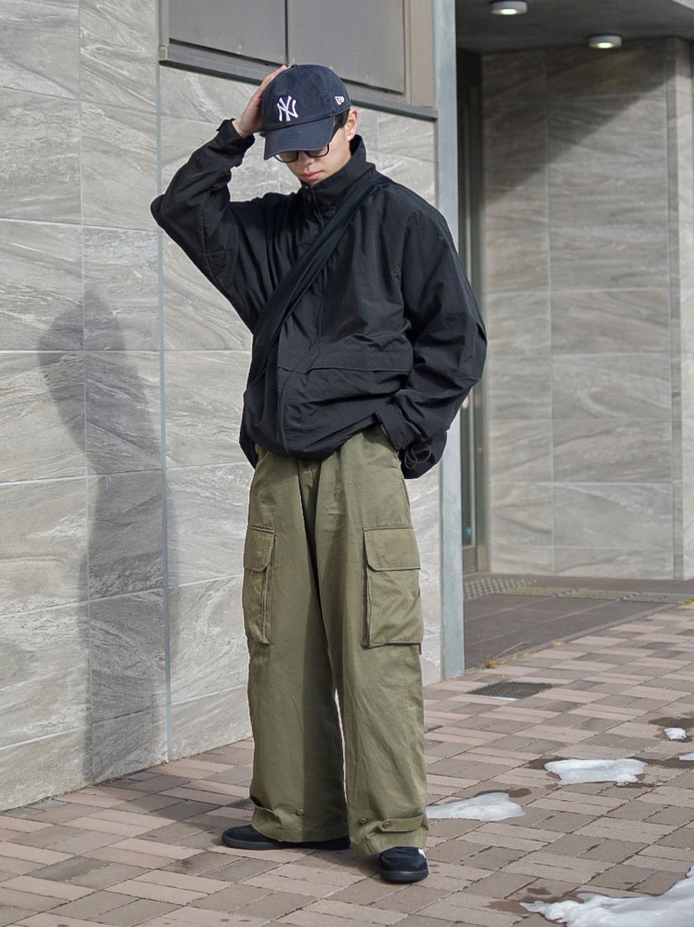 いつも見て頂きありがとうございます! 黒のナイロンジャケットにカーキの カーゴパンツを合わせた大人カジュアルコーデ! 小物は黒で統一して全体をまとめました!