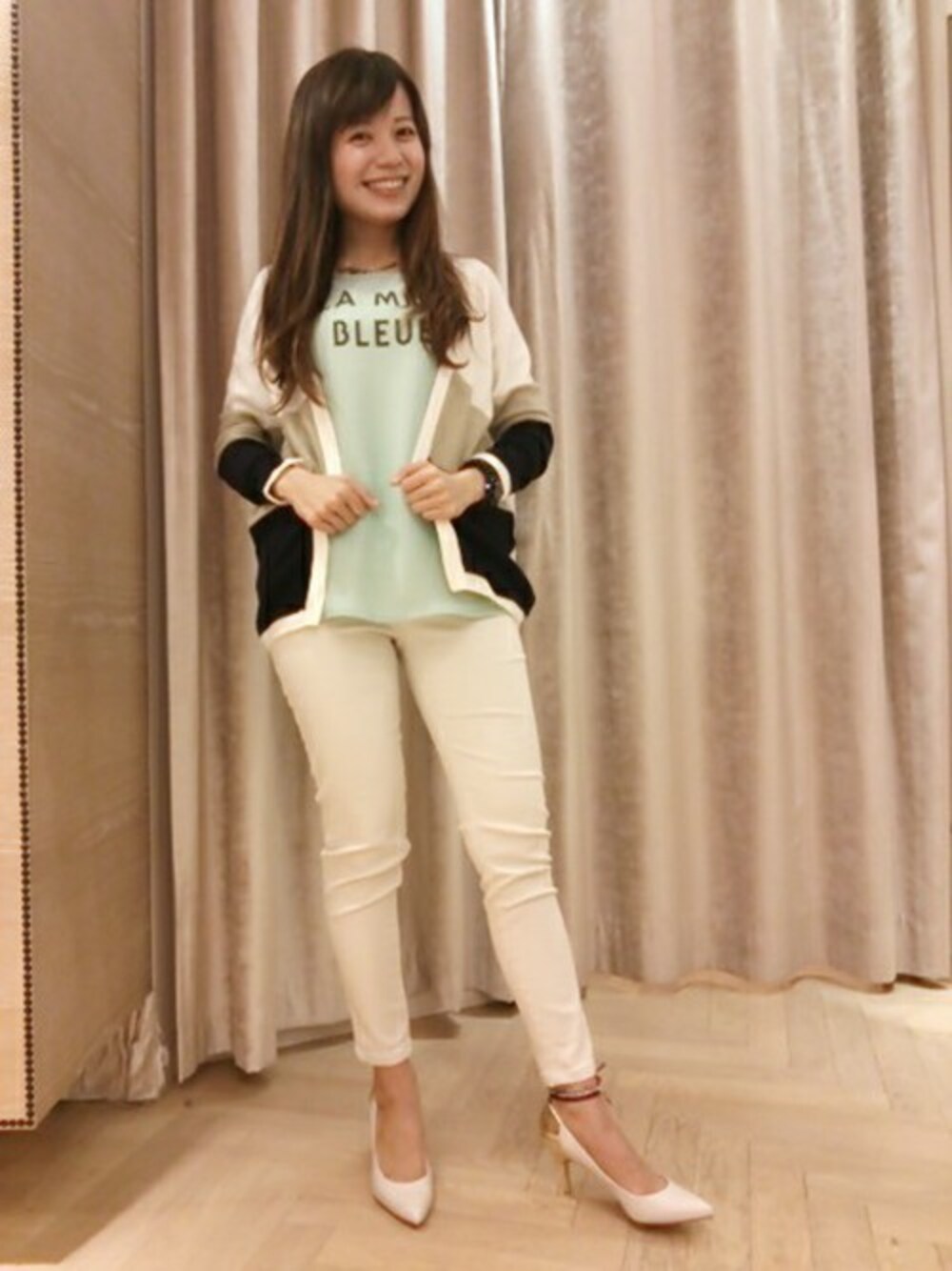 前身頃がブラウス素材のカットソーに動きやすいスキニーパンツと合わせて、 さらっとトッパ―カーディガンを羽織り、 動きやすさ満点のお出かけコーディネートにしてみました! カラフルで爽やかですよね☆