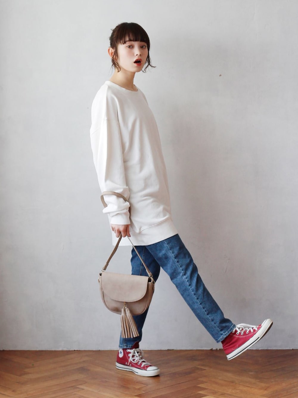 ビッグシルエットのシンプルスウェットを、メンズライクに。 赤のコンバースで差し色をプラス。 ------------ Instagram @crisp_official Twitter @crisp_official
