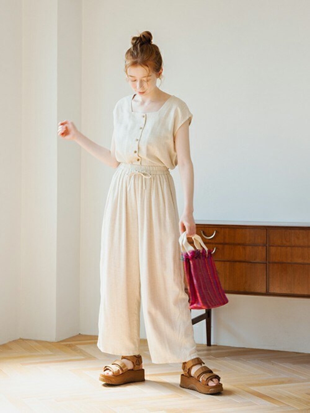 ナチュラルな風合いでシーズンムード高まるセットアップ。 ラフィアバッグを合わせてコーディネートを華やかに。 ------------ Instagram @crisp_official Twitter @crisp_official