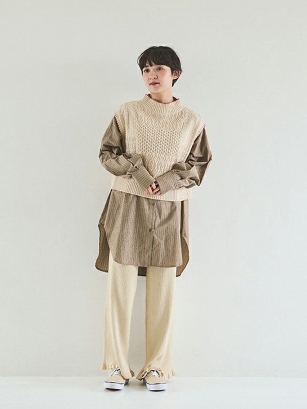 4種のケーブル編みを組み合わせたニットベスト。 ヴィンテージライクなオーバーシャツを合わせてナチュラルなスタイルに。 ------------ Instagram @crisp_official Twitter @crisp_official
