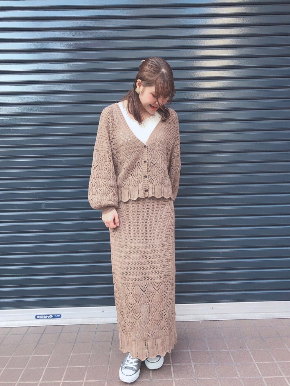 ご覧頂きありがとうございます! Crisp名古屋店のやまざきです ✿ 様々な編み模様が組み合わさっている 大人気のセットアップ! 私はbrownを着てみました 🐻💛 スニーカー合わせでカジュアルダウン。 スカートにはペチスカート付きです! 膝下が透けるようになっているので ロング丈でも重たくならず着られますよ🙌