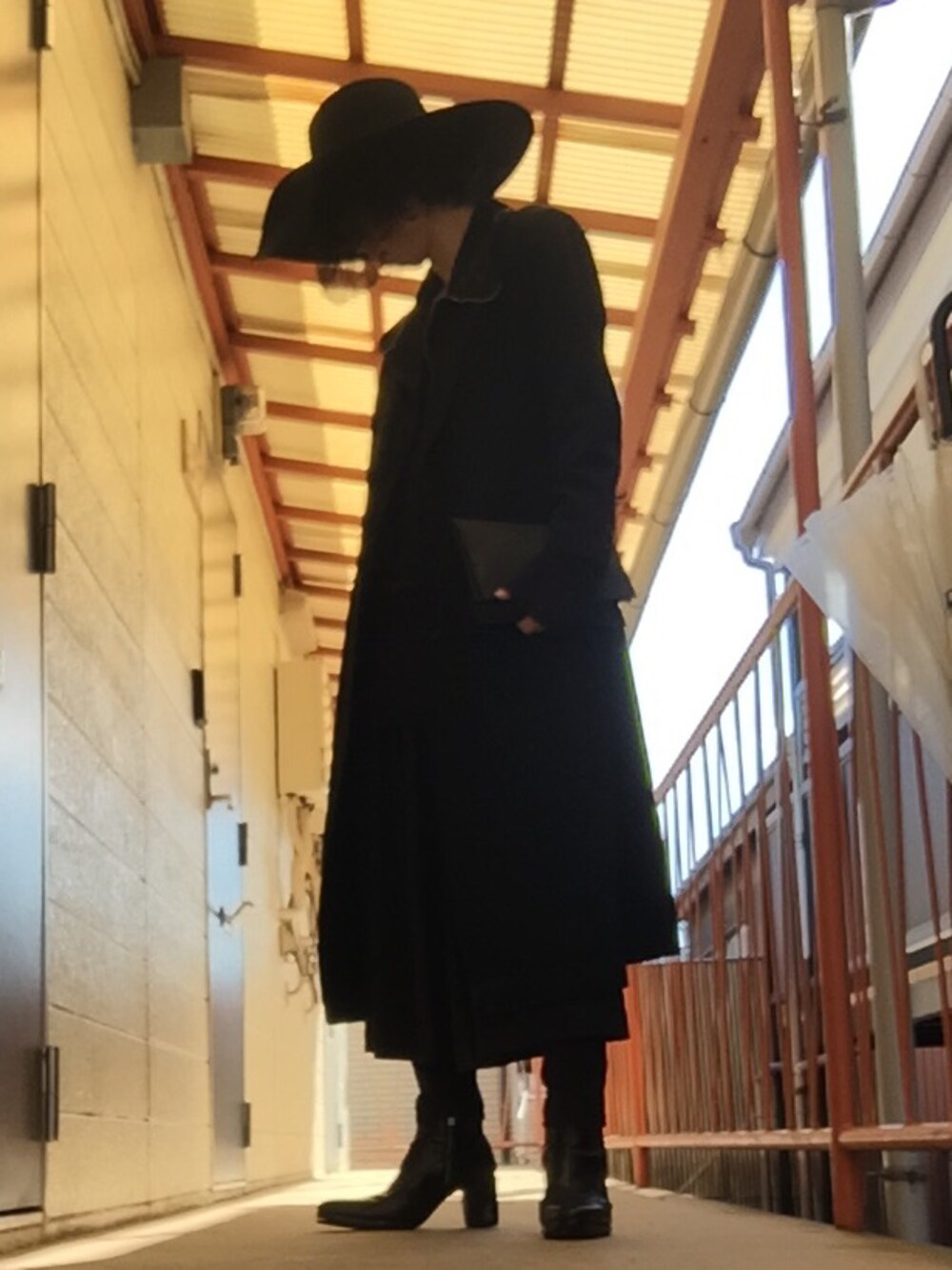 coat:ISSEY MIYAKE leather jacket:Rick Owens cut&sewn:Rick Owens pants:COS,LAD MUSICIAN heel boots:banal chic bizarre hat:Saint Lauret PARIS clutch bag:無印