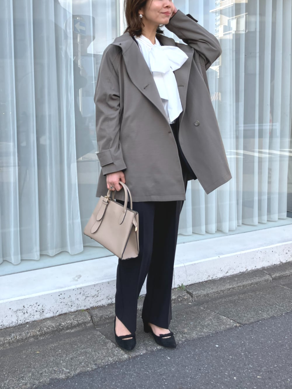 ECスタッフ(cross marcheメイン)のシャツ/ブラウス「《シワになりにくい》リボンボウタイボリュームシャツ【CROSS FUNCTION/クロスファンクション】」を使ったコーディネート