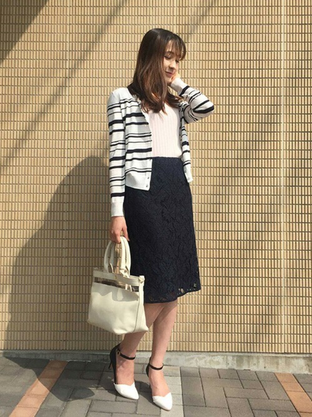 テーマ『”モテ”オフィススタイル』 接触冷感のカーディガンはオシャレなボーダーに! インナーは鎖骨のキレイに魅せるVネックのサマーニット。 通勤中やオフィスの冷房対策に欲しい一枚。 上品なレースのスカートはオフィススタイルの定番。 上司部下同僚からの好感度を独り占め!