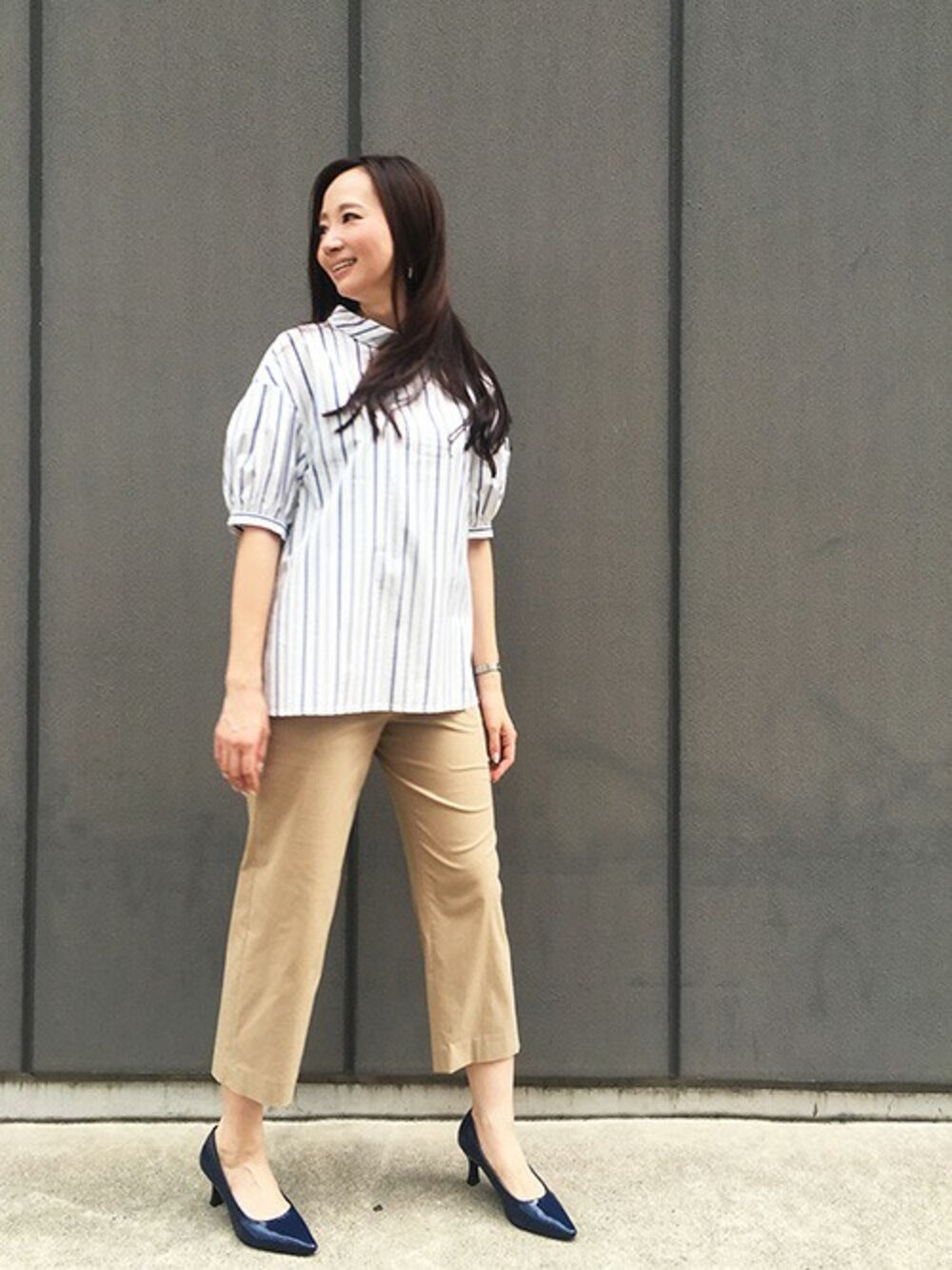CROSSPLUS(CROSSPLUS ONLINEメイン)のシャツ/ブラウス「ロールネックストライプブラウス」を使ったコーディネート