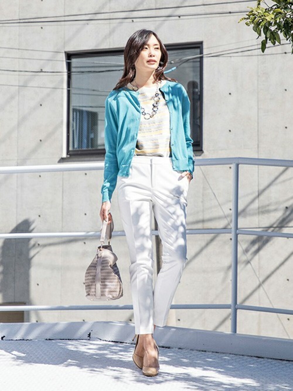 テーマ『オフィススタイル特集』 定番のクルーネックカーディガンは爽やかなブルーを選んで、 インナーにイエローボーダーの半袖ブラウスを合わせました。 さらにホワイトのテーパードパンツで じめじめ天気に打ち勝つコーディネートにしました。