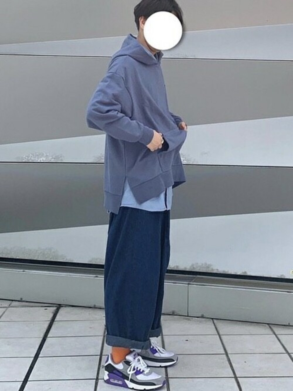 【トレンドのワントーンコーデ✨】ビックシルエットパーカー くすみブルーは派手すぎず地味すぎずコーデに溶け込んでくれます。ワントーンだけど、靴下にオレンジ🍊を入れてコーデのスパイスに。