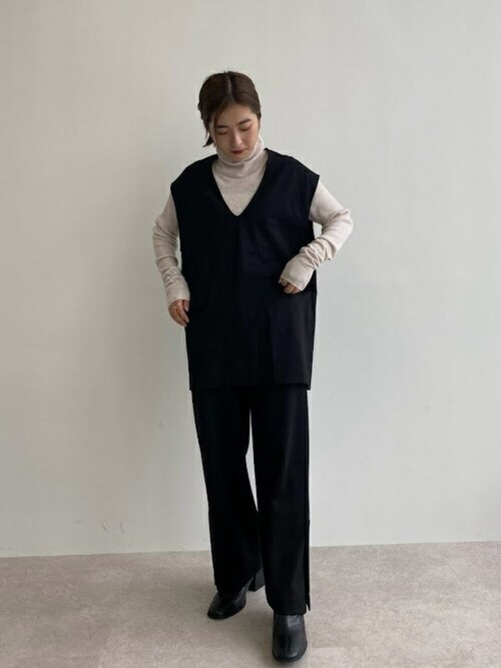 ベーシックとトレンドをMIXしたカジュアルスタイルを叶えるセットアップ。 深めVネックが女性らしさを引き立てるベスト
