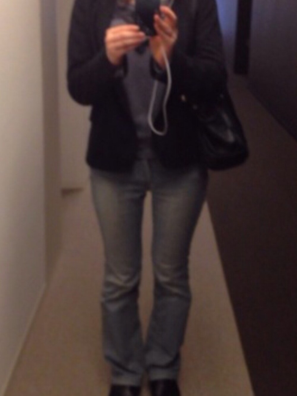 ブルー系のノーカラージャケットを着用したレディースの春コーディネートの1枚目の写真