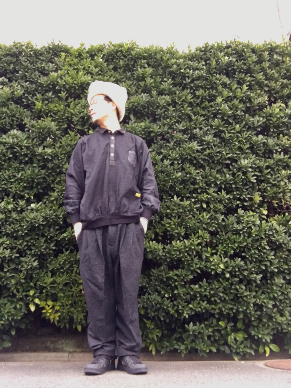 ちょっとずつ違うブラックでコーディネート。帽子はモコモコ。