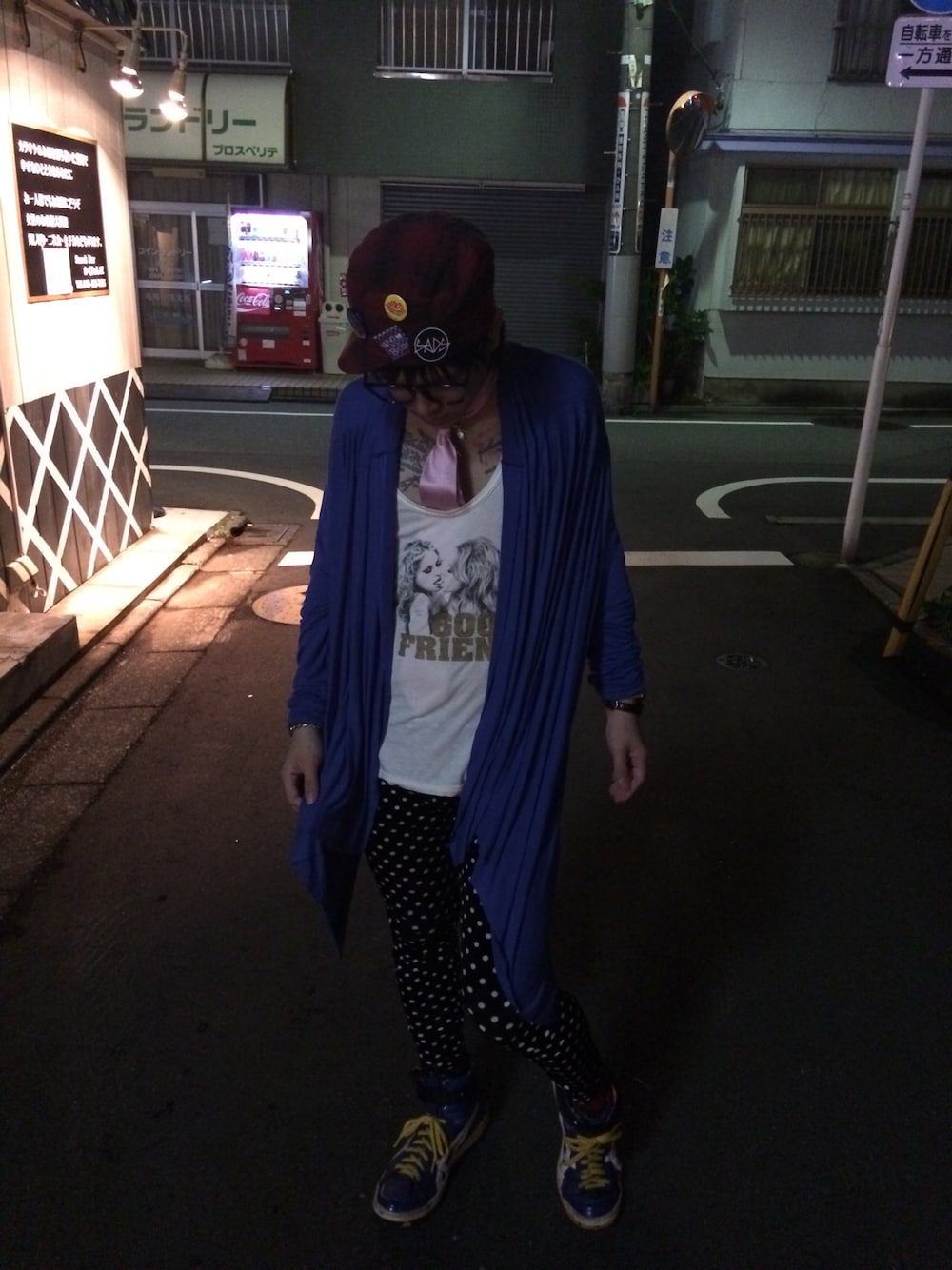 Tops:不明 Inner:charmcult GOOD FRIENDS期 Pants:KAWI JAMELE Hat:Moonage Devilment Ring:JUSTIN DAVIS Bracelet:Moonage Devilment Shoes:asics vintage Eye wear:あいにゃんWEGO伊達