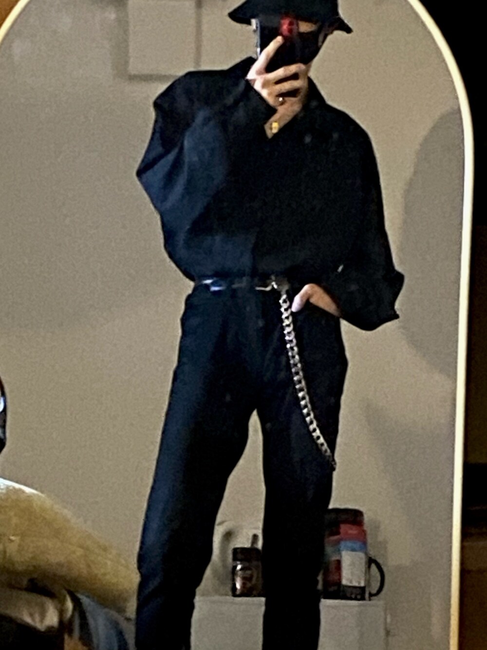 ブラック系のパンツ、ブラック系のシャツ/ブラウスを着用したメンズの秋コーディネートの1枚目の写真