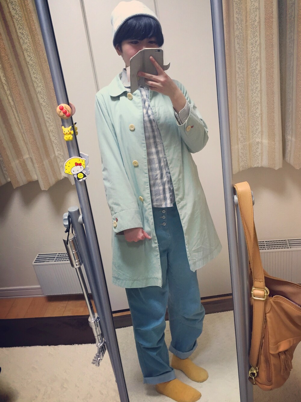 水色コーデです シャツはチェックとストライプの切り替えなんですよ🐥
