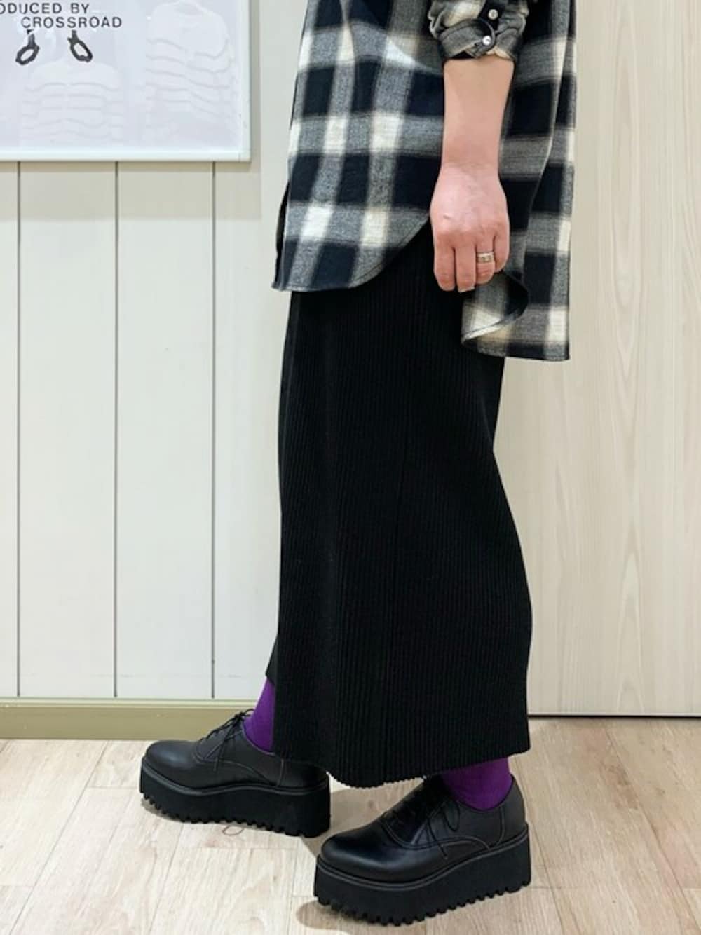 皆様こんにちは!続々と春の新作が入荷しております〜! そこで今回はスタッフのリアルコーディネートをご紹介いたします 合わせ方の1つとして参考にしていただけると嬉しいです 全体的に黒でまとめた大人カジュアルなコーディネートです♪ 差し色でソックスを紫にしたところがこだわりポイント 実はこちらの厚底シューズ、あしながおじさんで大人気だったデザインがリニューアルされたものなんです! 以前はベージュのラインが入っていたのですが、リニューアル後は全て黒に! オールブラックコーデにも使いやすいデザインに生まれ変わりました あしながおじさん 軽量|厚底レースアップシューズ(AS_7210119) カラー:ブラック,ブラックエナメル サイズ:22.5cm〜24.5cm 価格:¥19,580(税込) リニューアル前は少し大きめなサイズ感だったのですが、リニューアル後は履き心地も改良されております こちらのスタッフは普段通りのサイズで着用しています甲が高めなスタッフですが、紐で調節ができるので窮屈感はないとのことでした さらに踵に芯が入ったのでリニューアル前のものよりもホールド感が増しています! (この芯は硬いものではないので靴擦れの心配は無いですよ◎) かなりボリュームのあるソールですが、軽量素材を使用しているので見た目ほど重たくないんです! ヒールは約6cm、前底の厚みが約4.5cmと実際の傾斜はかなり緩め。たくさん歩く日にもオススメですよ スッキリとしたシルエットなので可愛くなりすぎず大人でも履きやすいデザインになっています シンプルなので様々なお洋服に合わせていただきやすいかと思います いかがでしたでしょうか もしコーディネートに迷ったり合わせるアイテムに悩んだらお気軽にスタッフまでご相談くださいね 最後まで読んでいただきありがとうございました!