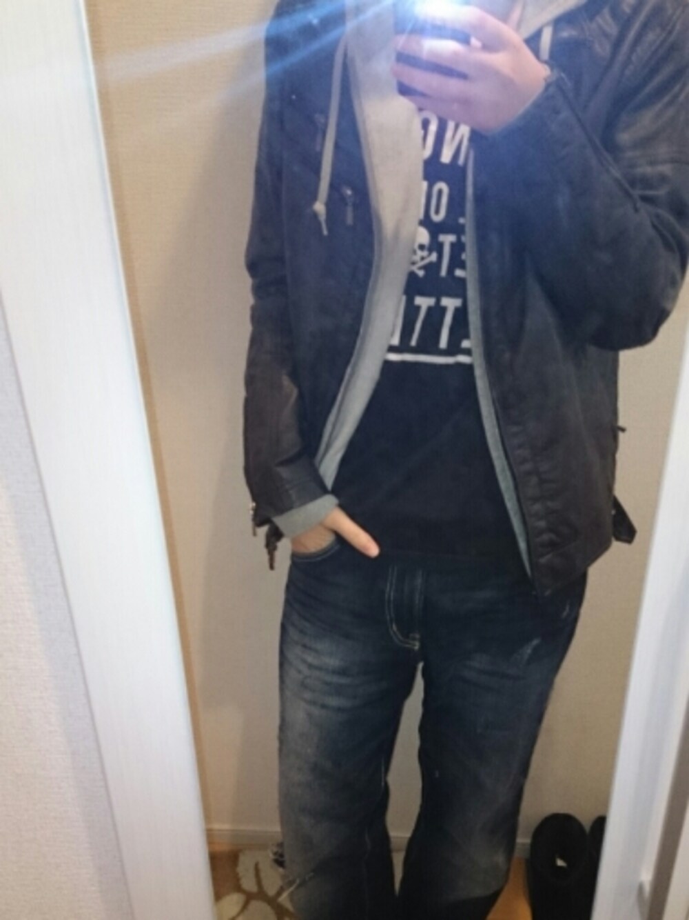 春めいてきましたので、革ジャン着てみましたヽ(*´∀`)ノ...ブランド?安定のイオンブランドだよ!( ¯q¯ )
