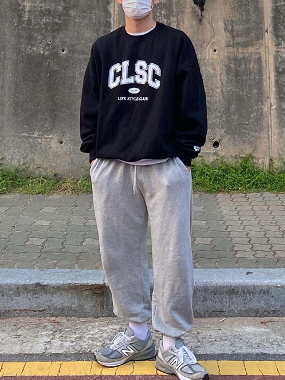 ブラック系のスウェットを着用したメンズの冬コーディネートの1枚目の写真