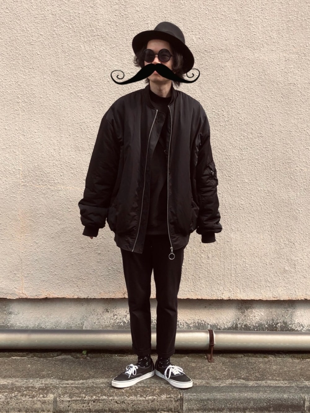 ブラック系のハットを着用したメンズの春コーディネートの1枚目の写真
