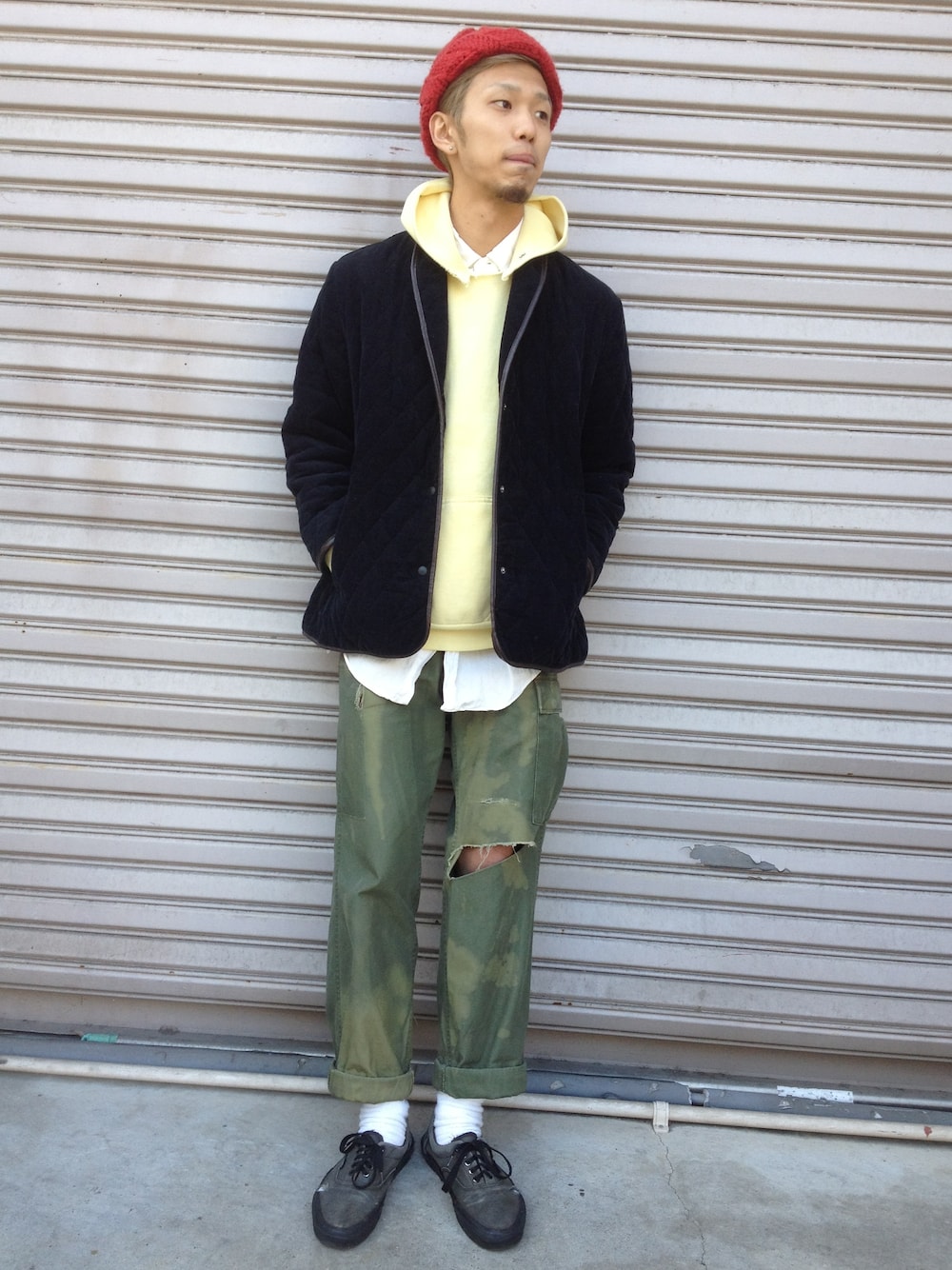 クソ寒いのでキルティングJKT 久しぶりにクルーザー乗って通勤してみました、気持ちいいですね〜 スケボーしたい!! 菓子パン食べながらの投稿です。 アウター:OLD キルティングJKT パーカ:90s airwalk シャツ:60s vanhousen パンツ:60s ARMY trousers スニーカー:80s vans "ERA"