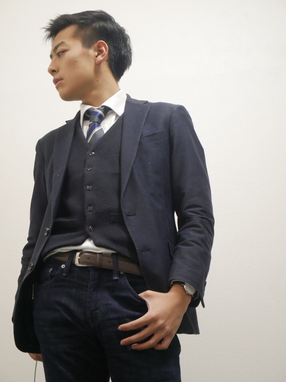 【ストレッチデニムライクジャケット】 本日着用しているジャケットはデニム生地のように見えるジャケットでございます! 本日も私がお仕事だったため、かっちりとした印象になっておりますが、インナーをVネックやクルーネックのTシャツに代えるとよりカジュアル感を出すことができます! デニムパンツによく合い、お持ちのデニムパンツとあわせてセットアップのように使うことができるので、これ一点で様々な着こなしができるものとなっています! こちらのジャケットは私用、公用を合わせると私が最も着用している愛用ジャケットでございます。 ぜひご覧ください! https://store.mac-house.co.jp/SHOP/11131200060.html