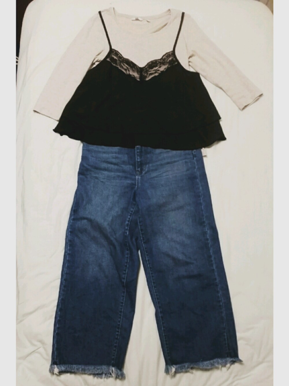 w closetのキャミソール×UNIQLOのTシャツ。 ワイドパンツの裾のフリンジも気に入ってる☺ UNIQLOのTシャツ、だいぶ前のです、下手したら5年前とかの。笑 ワイドパンツ、一応クロップドだけどちびだからふつうの丈になる😂