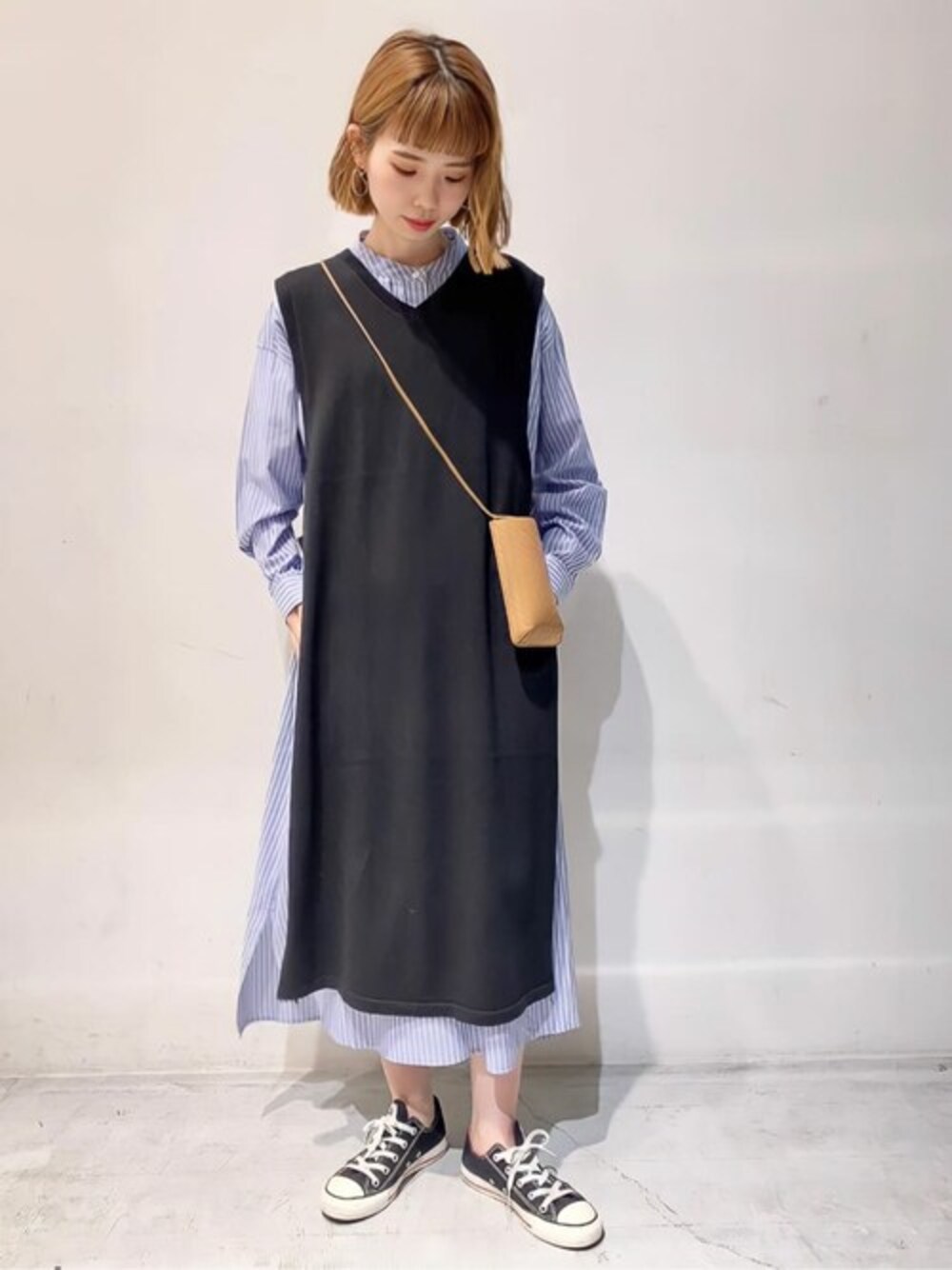 身長:160 ◆シャツワンピース ・着用サイズ:F 【着用感】 ・胸元のピンタック仕様がさりげないオシャレポイントです。締め付け感もなく柔らかく軽量感があるので着心地も良いです。シャツワンピースというと開口型が多いイメージですが、こちらのシャツワンピースはニットベストやプルオーバーなど上から重ねるスタイリングで楽しんでいただけます◎ ◆ロングベスト ・着用サイズ:F 【着用感】 ・サイドがざっくりと開いたデザインで今年らしいスタイリングが一気に完成します。ロング丈で体型カバーにもなりますし両サイドのスリットが軽やかな雰囲気も出してくれます◎レイヤードスタイルのお助けアイテムです♩ ◆ショルダーバック ・程よくツヤのある型押しデザインです。 長めのハンドルなので斜めがけにも適しています。バックの裏側には便利なカード入れポケットもありミニマムながら優秀です。