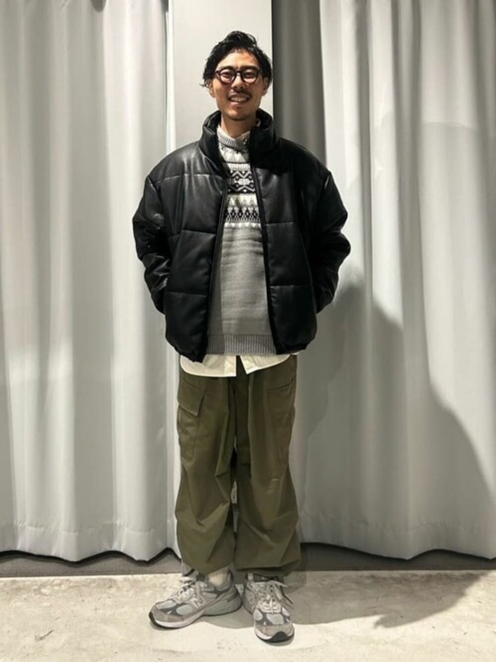 ◆ フェイクレザー中綿スタンドブルゾン 着用サイズ :Lサイズ 中綿がぎっしりと入った中綿ブルゾン! フェイクレザーのため、表面は光沢感もありサラサラした肌触り。 汚れても水拭きで拭き取れてお手入れも簡単! 身幅はたっぷりしているので、重ね着もしやすいです! 裾と袖は風を通さないようにゴムリブ仕様になっており、フロントチャックのため脱ぎ着が楽ちんです! スタンドカラーのためマフラー入らずですね◎ ◆ 【男女兼用】求心柄クルーネックニット 着用サイズ :Lサイズ 冬の代表的な柄でもある求心柄のニット! 首を中心に半円になっている柄はコーディネートのワンポイントにもなりますね! 毛並みが長くふわっとした肌触りが気持ちの良いのが特徴! ラグラン仕様でルーズな感じな印象。 袖まやや長めでゆったりとした身幅になっております! 襟と袖と裾のリブもしっかりしていて、広がりにくいです! 男性女性どちらにもおすすめです◎ ◆ポリエステルウェザーカーゴパンツ 着用サイズ :Lサイズ ポリエステル100%素材のため、軽くて動きやすいのが特徴。 またシャカシャカした素材で洗濯後の速乾性にま優れておりすぐに乾きます! ゆったりしたお尻周りから裾にかけてストレートなシルエット。 丈感も長すぎず、裾は紐で絞れるようになっているため、ボリュームあるスニーカーとも合わせやすいパンツです! カーキのカーゴパンツ1着持っているとコーディネート幅も広がりますね◎