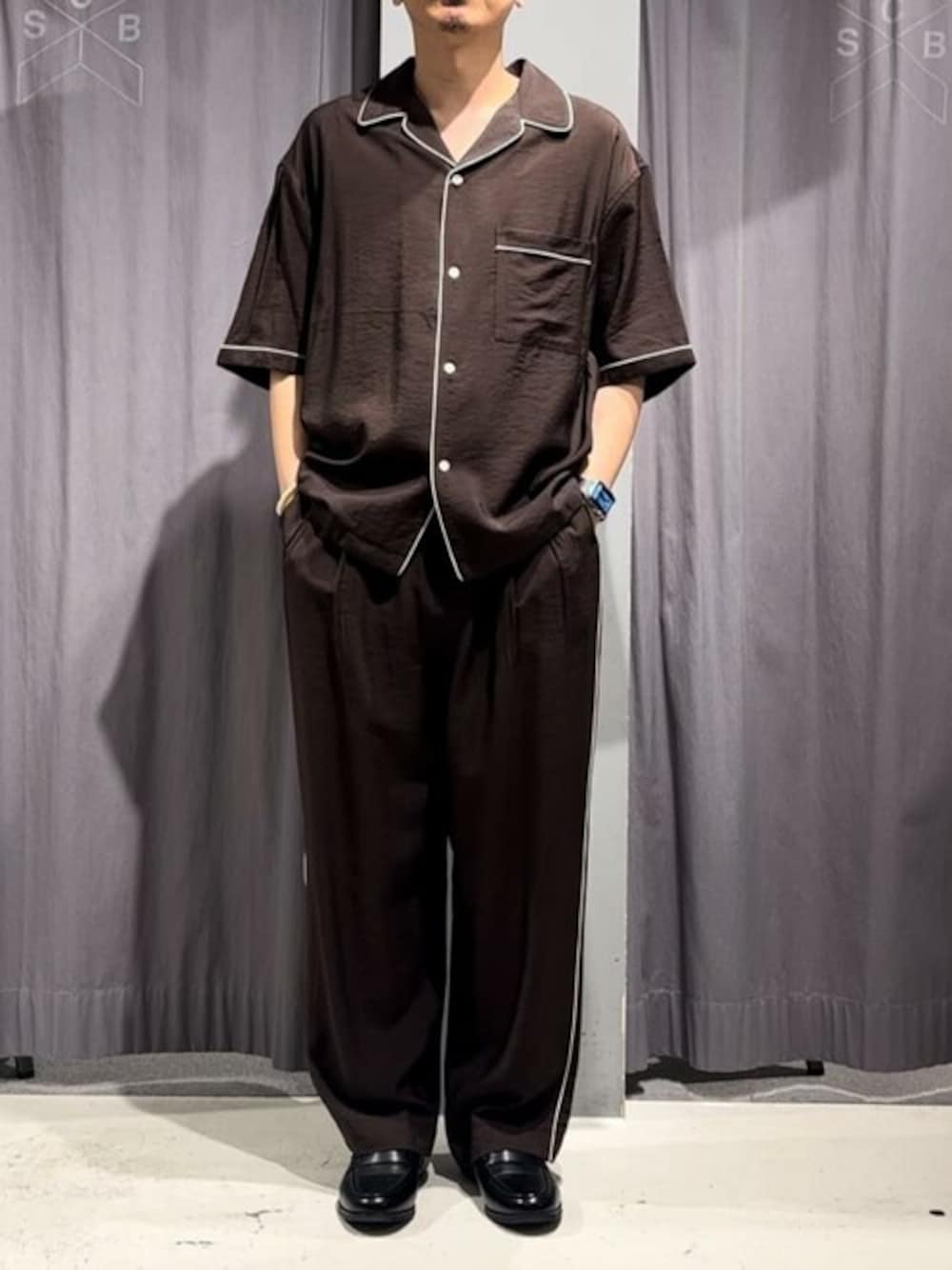・レーヨントロミハーフスリーブシャツ 独特のな光沢とシワ感のあるレーヨンナイロン素材で仕立てたハーフスリーブシャツ。 バイカラーのパイピングが上品なアクセントをプラスしてくれます。 とろみ素材の柔らかな着心地で、大人のリラックスムードを演出。 同素材のパンツとセットで着用するのもおすすめです。