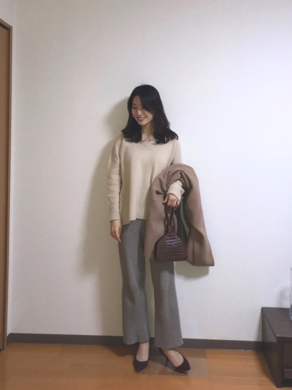 2021.2 最近、癒されたいのかしら…😇癒される服を着た自分に癒されてもらうという…😇 癒されたい気持ちが全面に出て、上下ニット、ベージュで出勤なり…😇 柔らかく、包まれたような…💓 バックは2000円しないくらい✌️😍