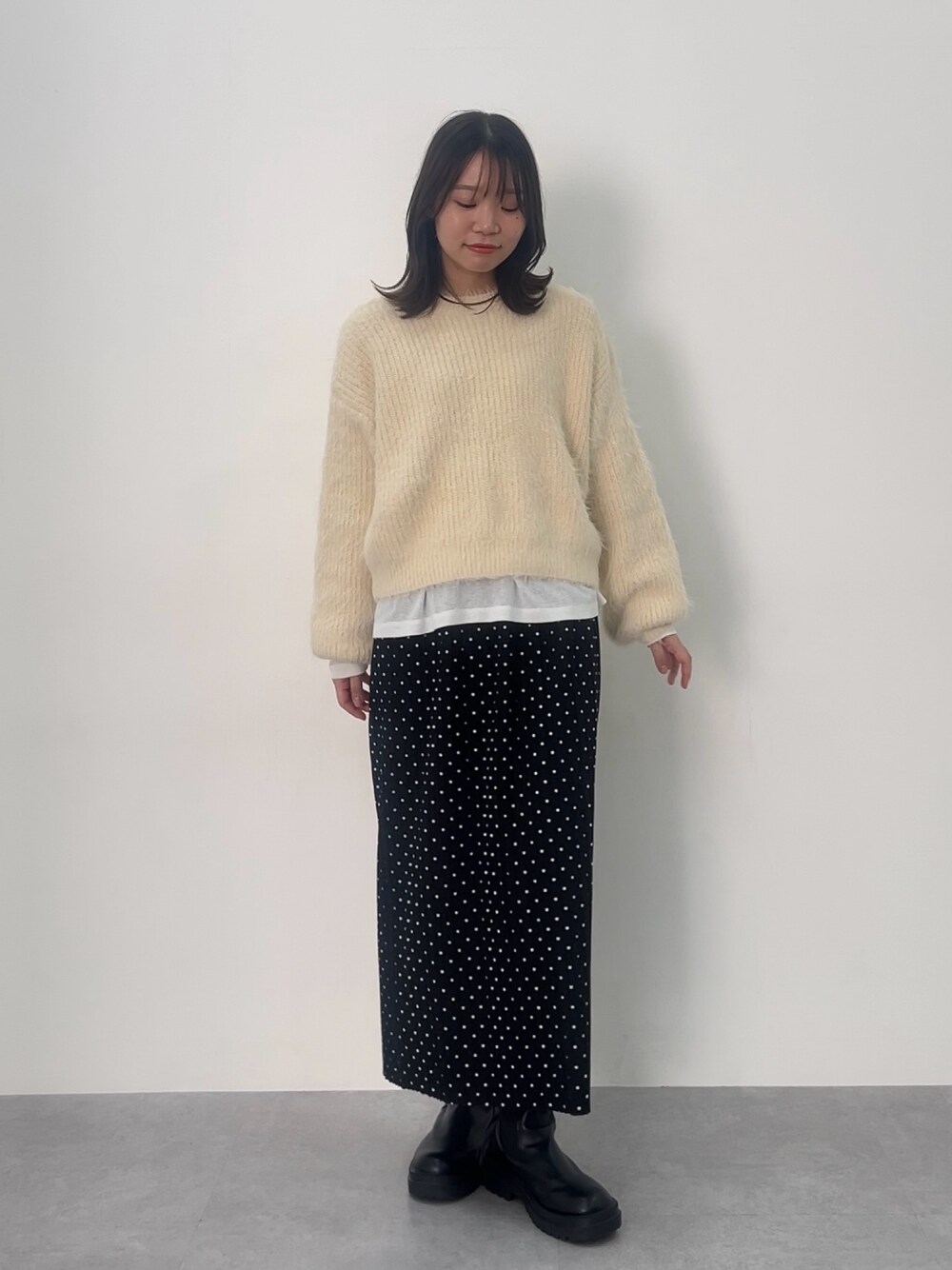 ドットのスカートが主役の王道かわいいコーデ♡ フェザーヤーンニットは短丈なのでレイヤードして バランスとるとちょうどよく着られました◎ スカートは158cmでくるぶし上くらいの丈感でした --------------------------------------- 身長:158cm 骨格:ナチュラル --------------------------------------