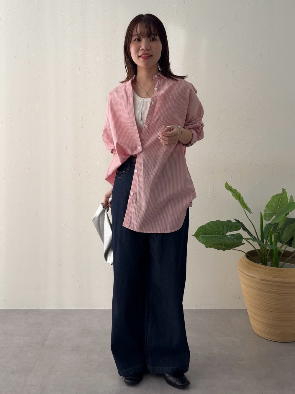 【トップス】 ・ストライプシャツは、あえてボタンを多めに開けてインナーを見せることで抜け感を出しました。 ・骨格ナチュラルが得意な「片側だけイン」するアシンメトリーな着こなしで、重心を散らしてオシャレ見えを狙っています。 ・オーバーサイズな身幅と長めの袖丈が、骨格を優しくカバーして華奢な印象を与えてくれます。 ・襟を少し抜いて着ることで、首まわりをスッキリ見せつつ、バックスタイルにもボリュームを持たせました。 【ボトムス】 ・深めのインディゴデニムが、明るいピンクを引き締めて大人っぽい配色に仕上げてくれます。 ・158cmで裾がワンクッションする丈感は、脚のラインを真っ直ぐ長く見せる黄金バランスです。 ・ワイドシルエットのゆとりが、シャツのルーズな雰囲気とマッチしてリラックス感を演出。 ・ハリのあるデニム素材が、カジュアルな中にも程よい「きちんと感」をキープしてくれます。 【シューズ・バッグ・小物】 ・シルバーのバッグを添えて、全体がほっこりしすぎないようエッジを効かせました。 ・華奢なネックレスをプラスして、開いた襟元に女性らしいアクセントを置いています。 ・足元は黒のフラットシューズで、コーディネートの土台をどっしりと落ち着かせました。 【スタッフのつぶやき】 ・甘くなりがちなピンクシャツも、デニムと着崩しテクニックでかっこよく着こなせます ✨