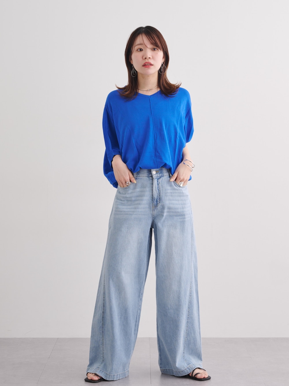 【トップス】着用サイズ:S~M ・骨格ナチュラルさんの肌を綺麗に見せてくれる、パキッとしたブルーのトップスを選びました。 ・ドルマンスリーブのようなゆったりした袖のラインが、肩のフレーム感を優しくカバーしてくれます。 ・Vネックのデザインが顔回りに抜け感を作り、158cmの私でも重たくならずスッキリとした印象に。 【ボトムス】着用サイズ:M ・ナチュラルさんが得意なボリュームのあるワイドデニムは、脚のラインを拾わずスタイルを補正してくれます。 ・ハイウエストで穿くことで、158cmでも驚くほどの脚長効果を実感できる組み合わせです。 ・淡いブルーのデニムを選ぶことで、トップスの鮮やかさが引き立つ、夏らしいクリーンな配色に仕上げました。 【シューズ・バッグ・小物】 ・足元は華奢な黒のストラップサンダルで、ボリュームのあるデニムに軽やかさと女性らしさをプラス。 ・シルバーのバングルとチョーカーを合わせ、ブルーのトップスに合うクールなアクセントを添えています。 【スタッフのつぶやき】 ・目を惹くブルーを主役に、デニムでカジュアルダウンすることで、頑張りすぎない大人の余裕を意識しました! ■Instagram:@_157018pi_