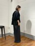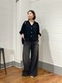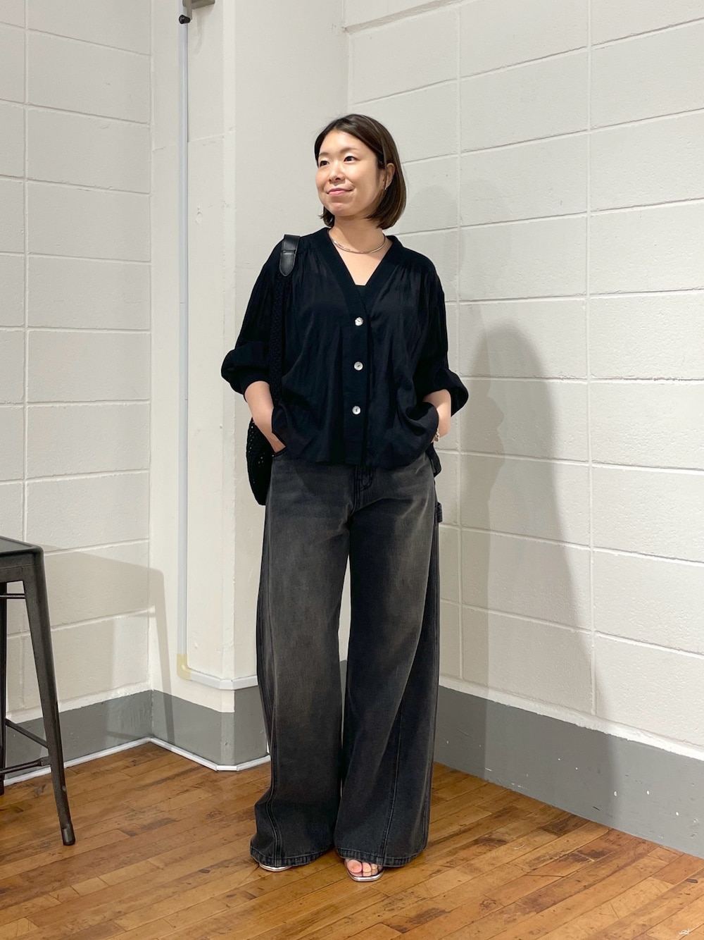 ・トップス 落ち感のあるシアー素材で、 身体のラインを拾わず スタイリングに抜け感が出るシャツカーディガン。 ギャザーデザインのおかげで表情が出るので ブラックでものっぺりしません◎ ・ボトムス 脚長効果抜群のデニム。 ウエストにアジャスターがついているので ウエストサイズを調整して履けちゃいます! 脚のラインはキレイに見るのに ゆったり履けて快適です★ ブラックもグレーよりの色味が出ているので 見た目が軽くなります。