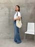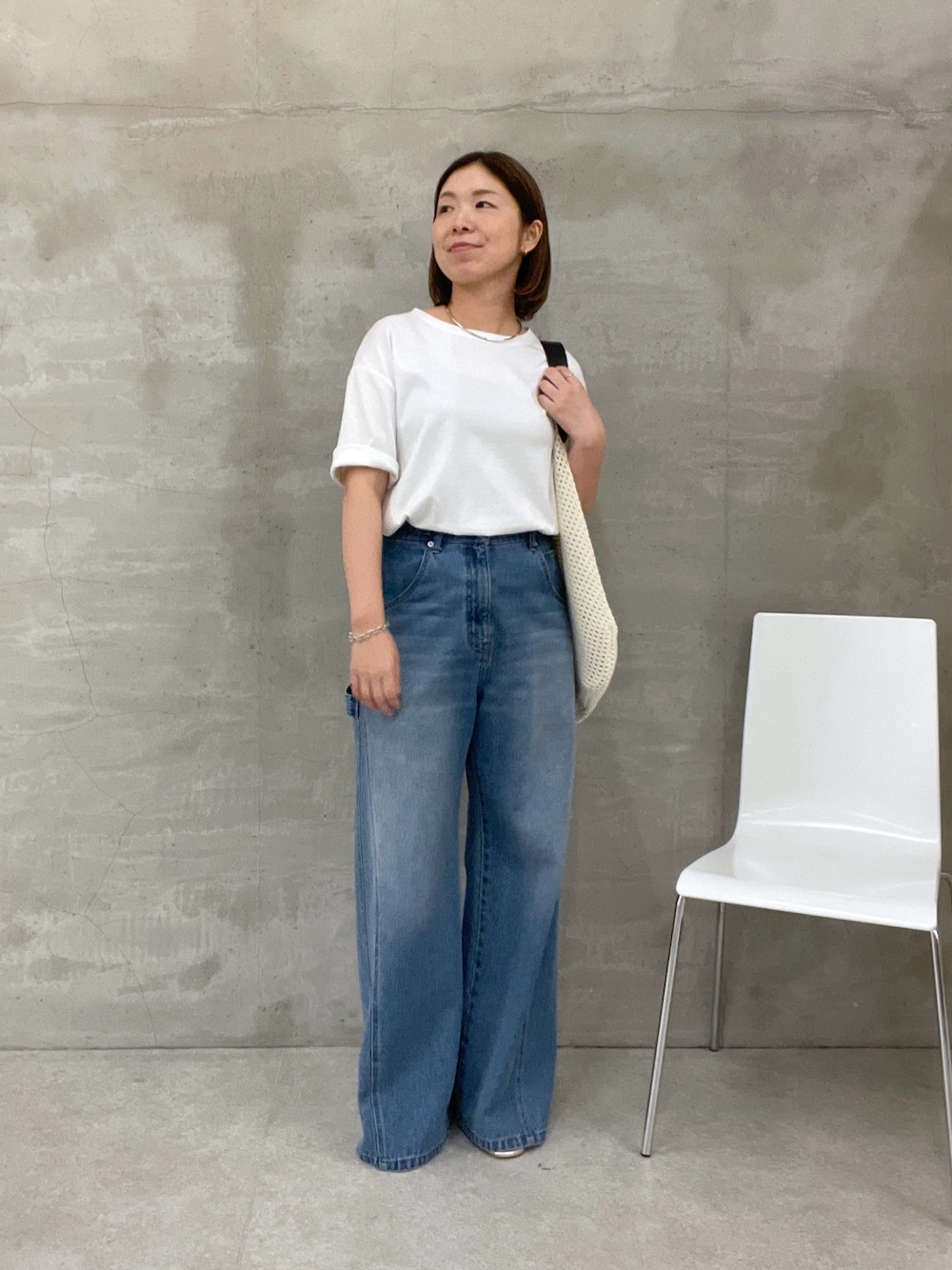 サイドにアジャスターが付いてるデニムは 高めの腰位置で履けるので ぽっこり下っ腹をカバーしながらも 脚長効果を発揮させてくれます♪ ウエストはスッキリ見えさせてくれて、 アジャスターで ウエストのサイズ調整を出来るので トップスインもしやすいです◎ シンプルな白Tシャツを着る時は 袖口を少し折ると腕もスッキリ見えします。 アクセサリーをプラスして アクセントになるバッグを合わせたら シンプルながらもこなれたスタイリングが完成します!