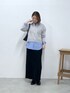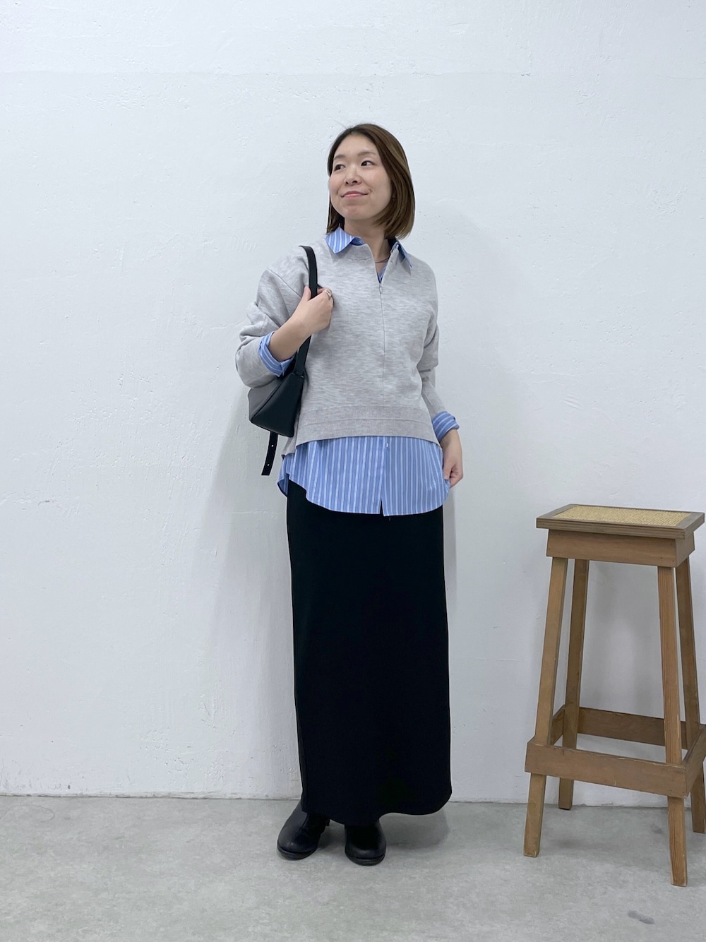 ストライプのシャツをアクセントにした レイヤードコーデ★ タイトスカートはフリーサイズを着用しています。 シャツの丈の長さが少し長いので ウエスト周りをカバーする役割も果たします◎ ニットは首元にファスナーがついているので 開け具合もお好みで調整できるのが嬉しいポイント! インしなくてもバランスよく収まるデザインです。
