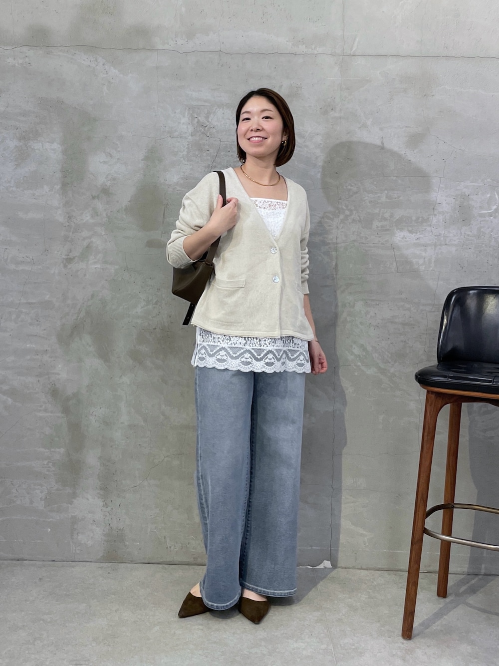 ベーシックで使いやすいデザインのカーディガンに トレンド感あるレースキャミを合わせて カーディガンコーデをいつもと雰囲気変えてみました! カーディガンはインナー合わせをすることが多いですが レースキャミを合わせることで 抜け感のあるスタイリングに仕上がります◎ レースキャミソールは アジャスターで長さ調整が出来るので ウエスト周りのカバーにも活躍します! デニムコーデも女性らしい印象になります。