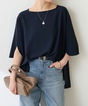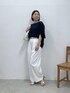 スタイリングにこなれ感を出したくて 白パンツを穿いてみました! トップスはブラックだと パキっとしすぎてしまうので ネイビーで柔らかさを出しています。 トップスは浅めのスクエアネックデザインが 上半身をすっきり見えさせてくれて 落ち感のあるジャージ素材なので 身体のラインを拾わず細見え効果抜群! 肘まで隠れる袖の長さも嬉しいポイントです。 ベルトでウエストマークをして メリハリを出しています。 パンツはサイズ1を着用。 3タックでゆとりがあるので 前だけインしてもごわつきません!