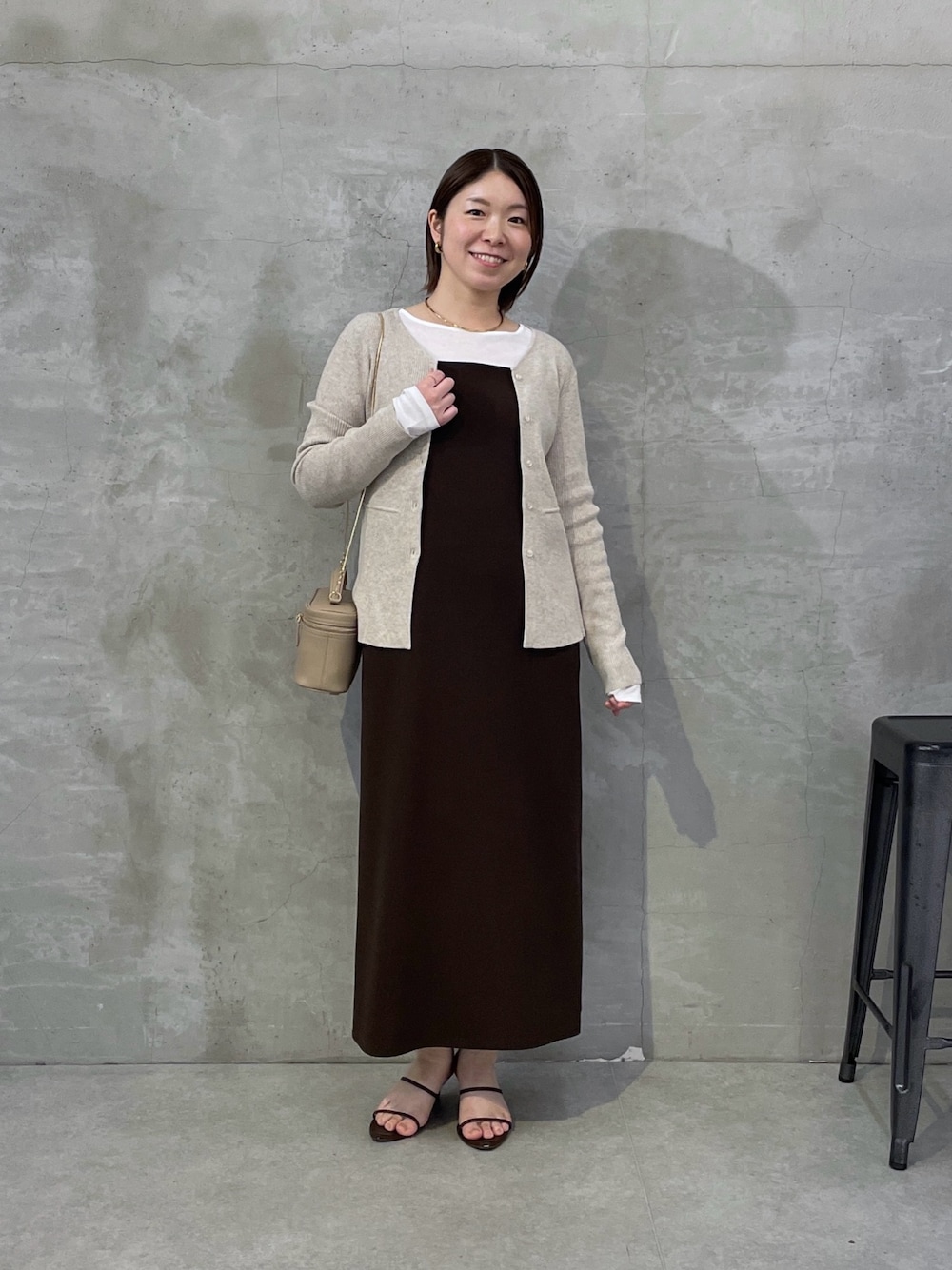 オールシーズン着られるキャミワンピ。 今の時期ならシアーのトップスをインナーにして 上からカーディガンを羽織るのがおすすめです! キャミワンピースは少しゆとりがあるので 上半身にコンパクトなシルエットのアイテムを選ぶと メリハリが出て着痩せて見えます。