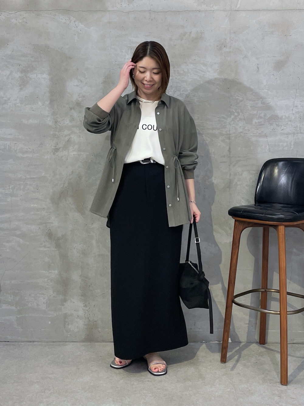 シアー素材のシャツを羽織にしてコーディネート★ シンプルだけど程よい存在感のあるインナーが ワンポイントになります。 シャツはシアー素材で、 袖口はリブなので袖まくりも簡単◎ 手首を出して着ることですっきりした印象に。 ウエストのドロストを絞ることで くびれ位置を主張する着痩せコーデが仕上がります。 スカート派ジャージタイトスカートのサイズ2を 着用しています。 ウエスト周りにゆとりがあるので、 インナーをウエストにインもしやすいです。 ベルトを付けることでワンポイントになり メリハリがプラス出来ます。