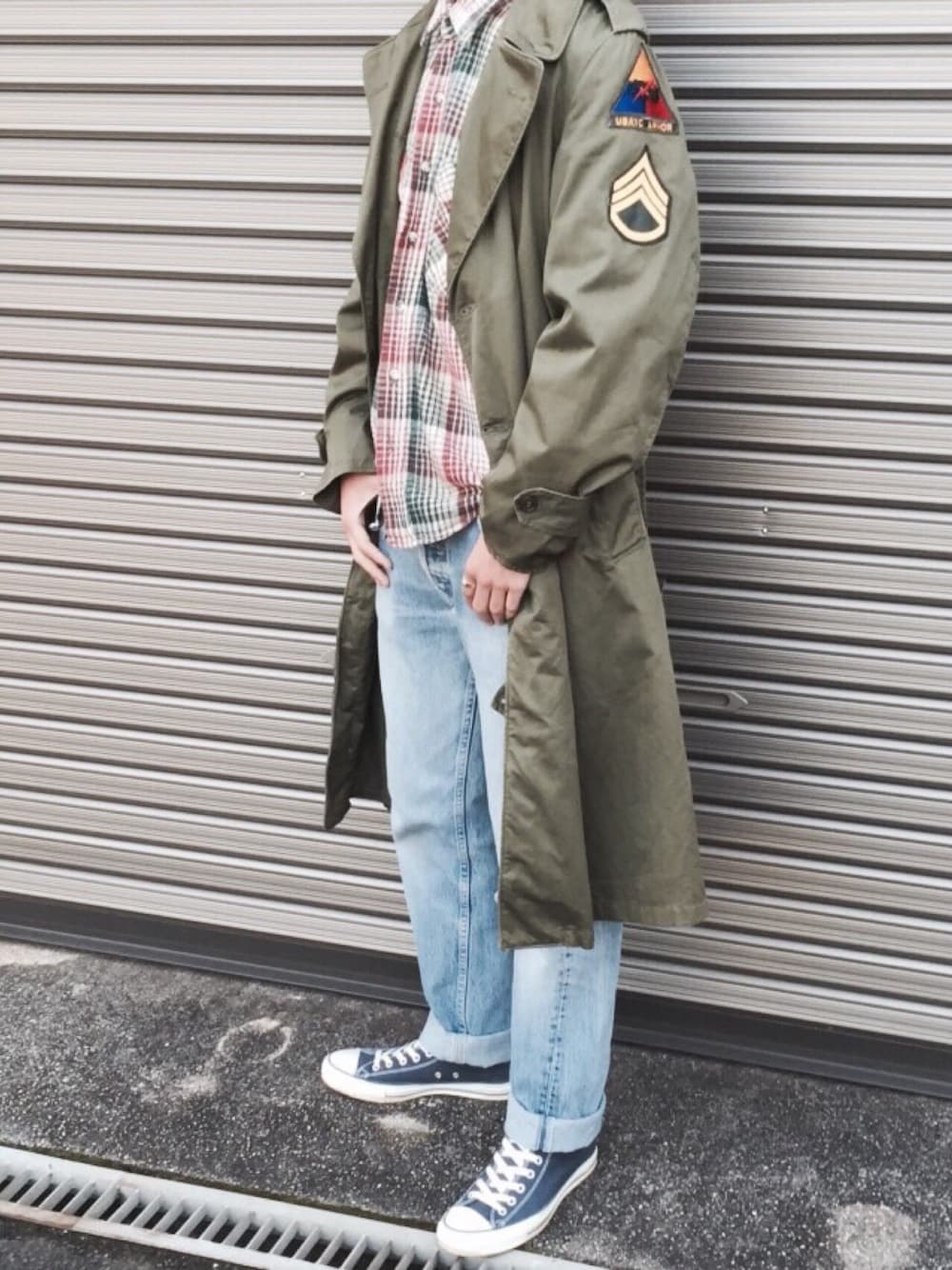 おはようございます‼︎日差しが眩しいですね‼︎天気がいいと本当に楽ですが季節が変わってきてるので本当の寒さがでてきました(笑)そんな今日はこのコーデで頑張りたいと思います‼︎ ジャケットは50sのUSA USATC ARMYコートになります‼︎このコートとにかく丈が長いです(笑)87sのコートよりも長いので持っている服の中で異質な雰囲気です(笑)約60年前の物になりますがデットストックで購入したためダメージはほぼ無く、肩には階級章とUSATCのワッペンついてます😊たまらないです(笑) シャツは定番のFIVE BROTHERのネルシャツになります‼︎柄が赤と緑を基調としているので気に入っています😊 デニムは90's levis 501になります‼︎ 靴はブライトオレンジと迷いましたがブライトオレンジにダメージをあまり与えたくなかったのでCONVERSEのネイビーにしました😊 今日も頑張りましょう‼︎ みなさんいいねやSAVEありがとうございます‼︎よろしければフォローよろしくお願いします(^^)